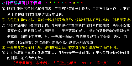 途径(经络穴位),能减少用药量,提高疗效,是一种很有前途的治疗方法。[水针疗法的特点]
